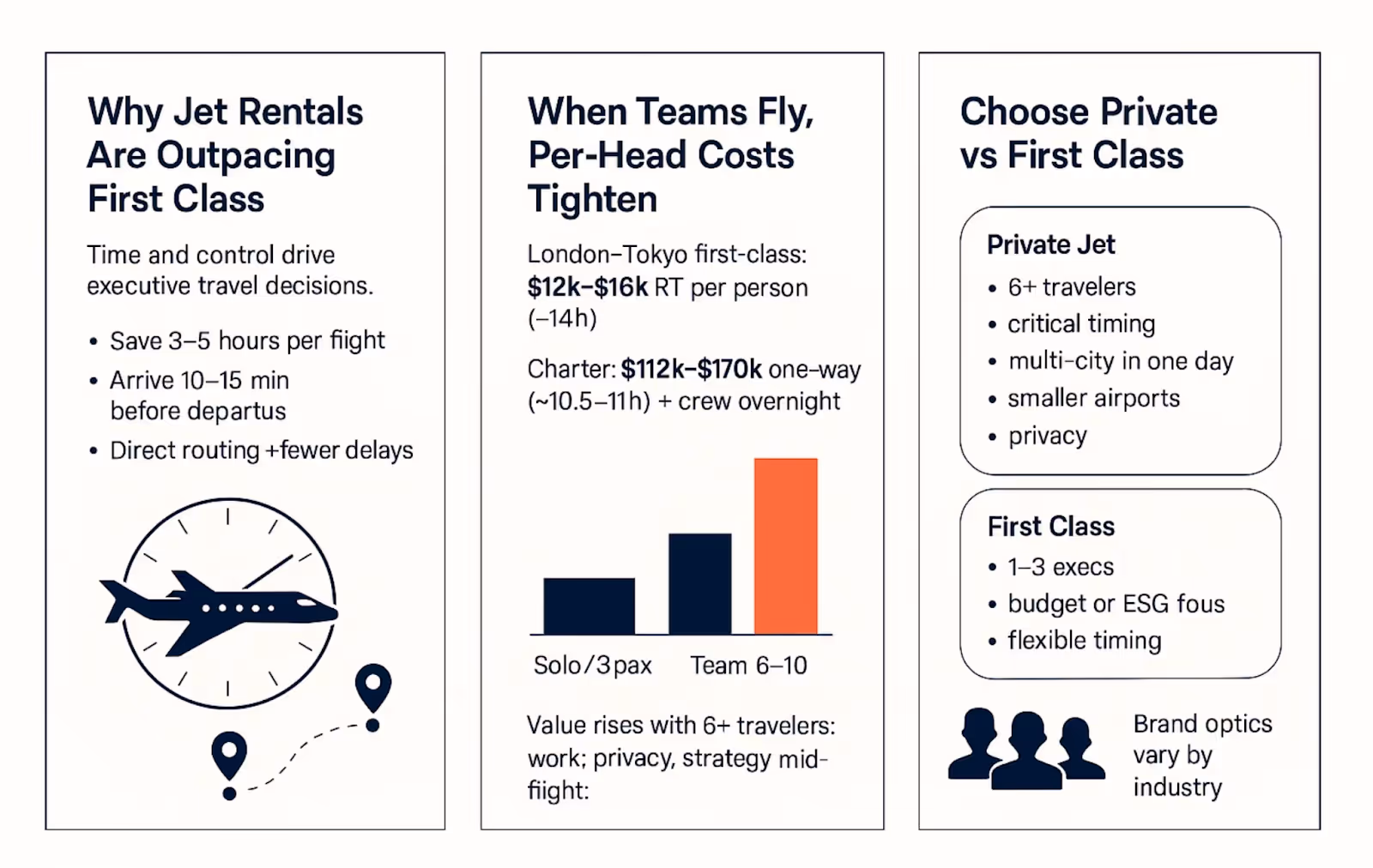 For a single executive or a very small team, the math is simple: Flying first-class on a commercial airline is almost always the more economical choice. There are other benefits to taking a private jet, but the cost wouldn’t be one of them in this situation. The cost of chartering an entire state-of-the-art aircraft for one or two people is a significant investment that commercial fares, even at the premium level, simply cannot match.